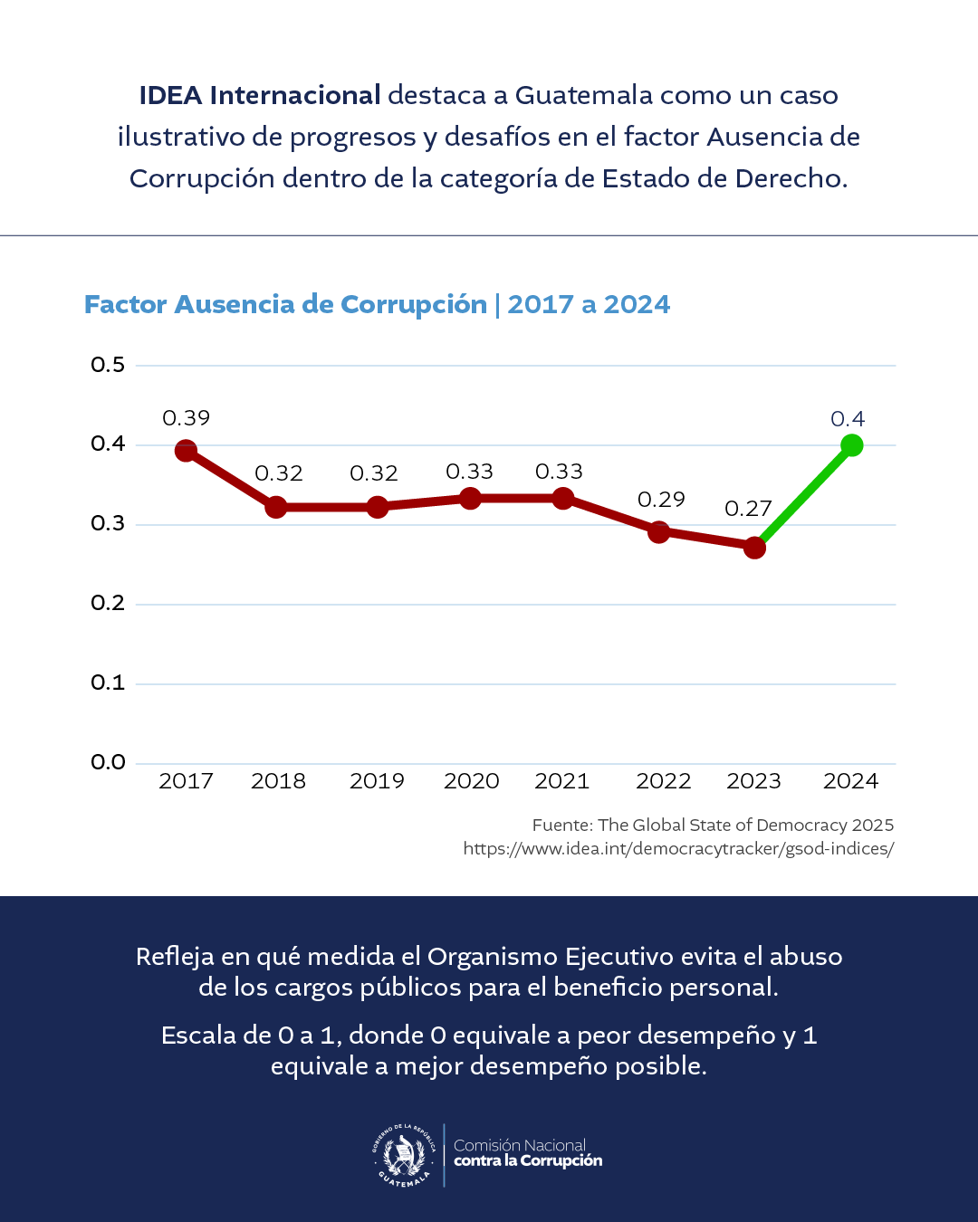 El Estado Global de la Democracia 2025, publicado por IDEA Internacional, reconoce a Guatemala por sus progresos en el factor Ausencia de Corrupción y dentro de la categoría de Estado de derecho.