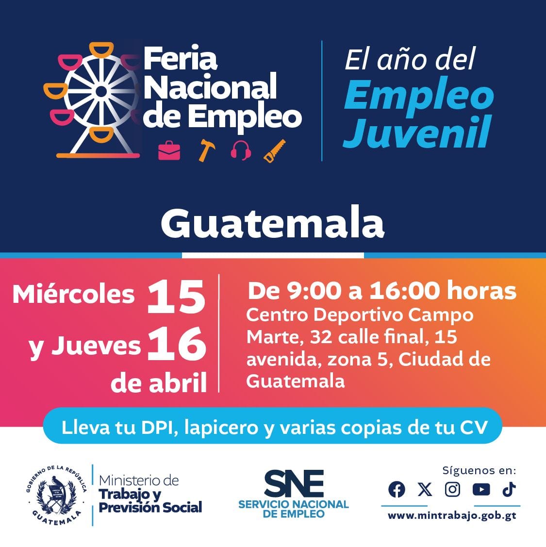 La inauguración será realizada en la Ciudad de Guatemala los días 15 y 16 de abril de 2026, en el Centro Deportivo y Recreativo Campo Marte, en horario de 9:00 a 16:00 horas. En esta sede participarán 150 empresas, ofreciendo más de 4,000 plazas laborales.